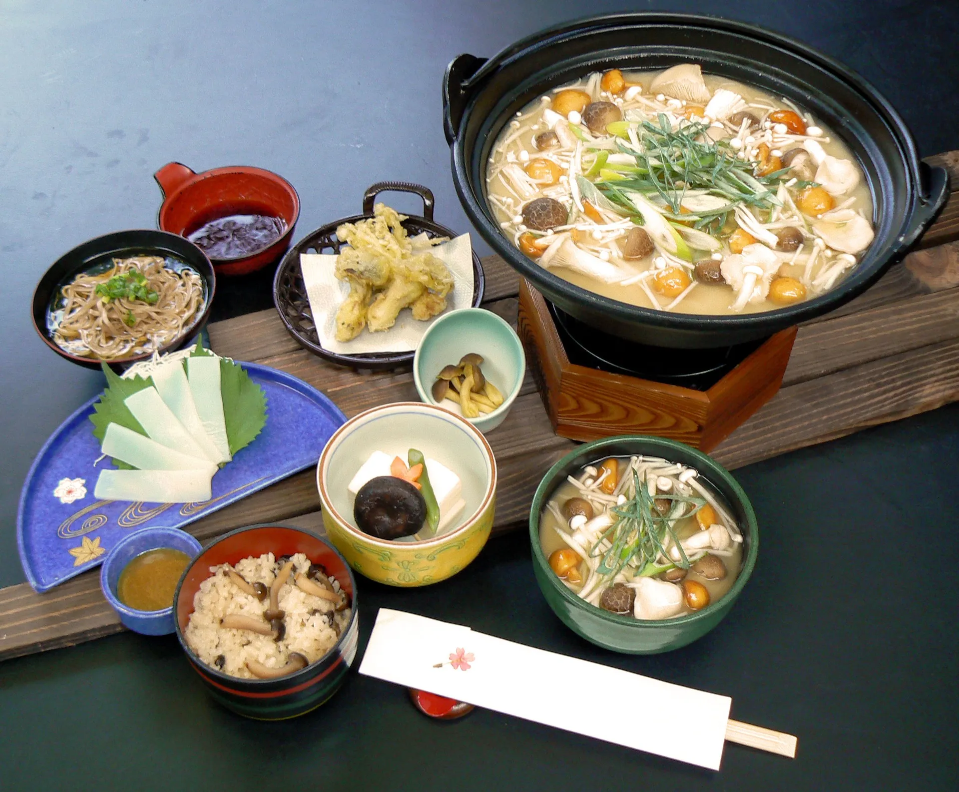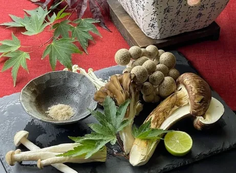 - 松茸と和牛の陶板焼き、松茸鍋、松茸ときのこの天ぷら、松茸の土瓶蒸し、松茸ごはん、信州そば、季節の3点盛り、季節のデザート