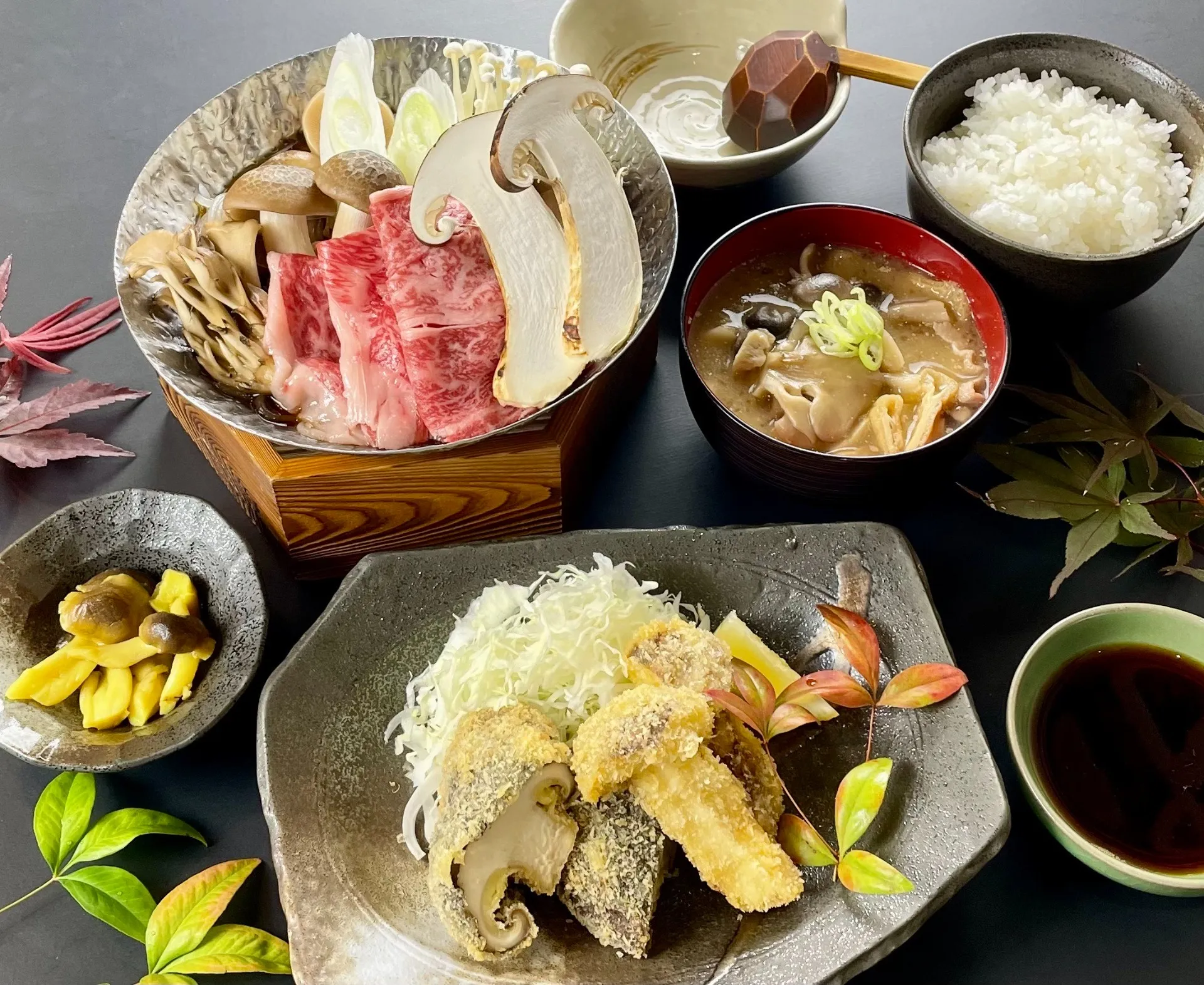 松茸と信州プレミアム牛のすき焼き/松茸フライ/肉厚椎茸のフライ/白飯/きのこ汁/辛子しめじ